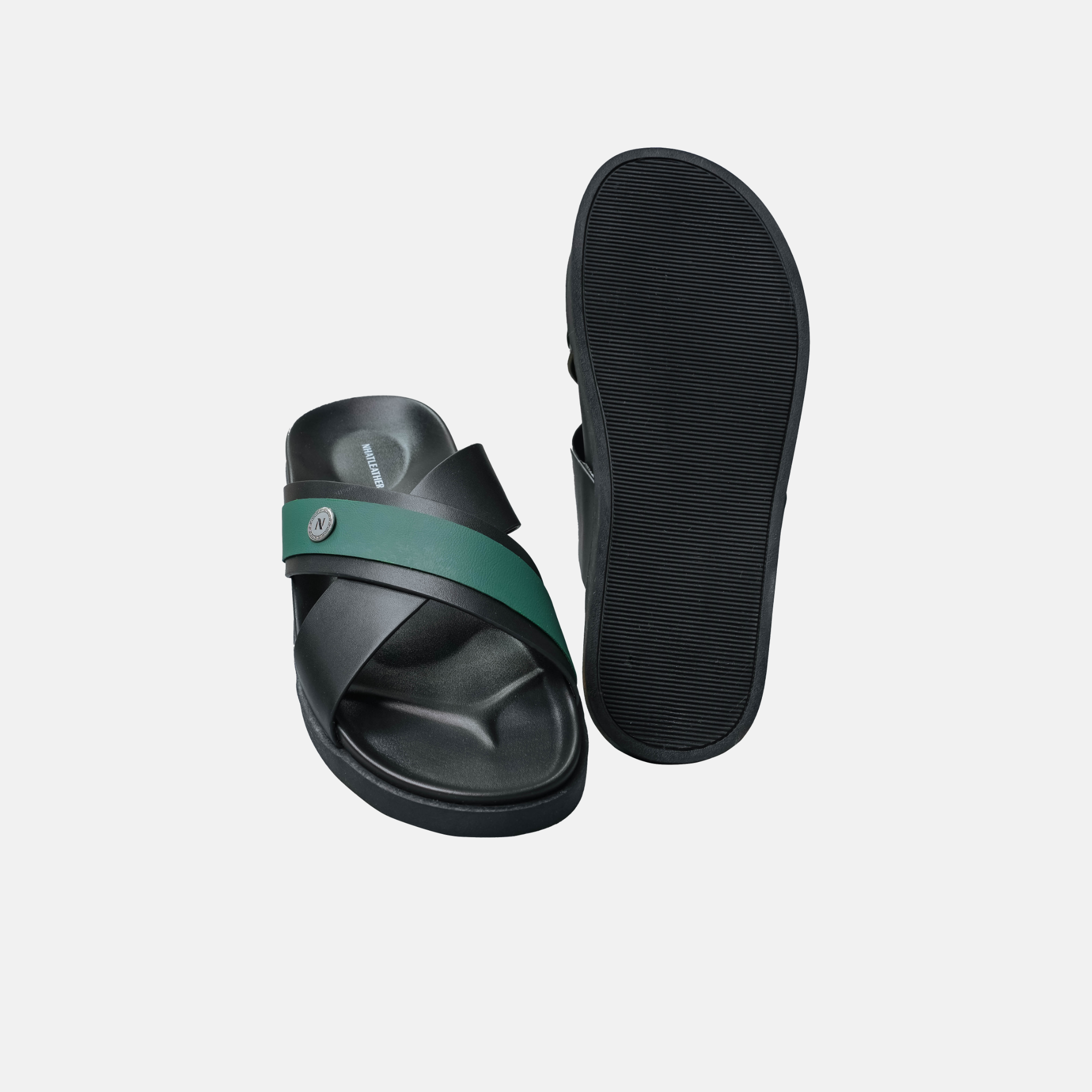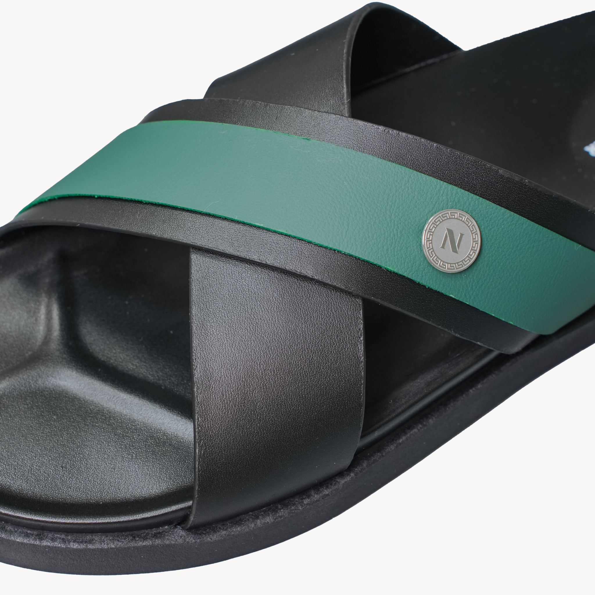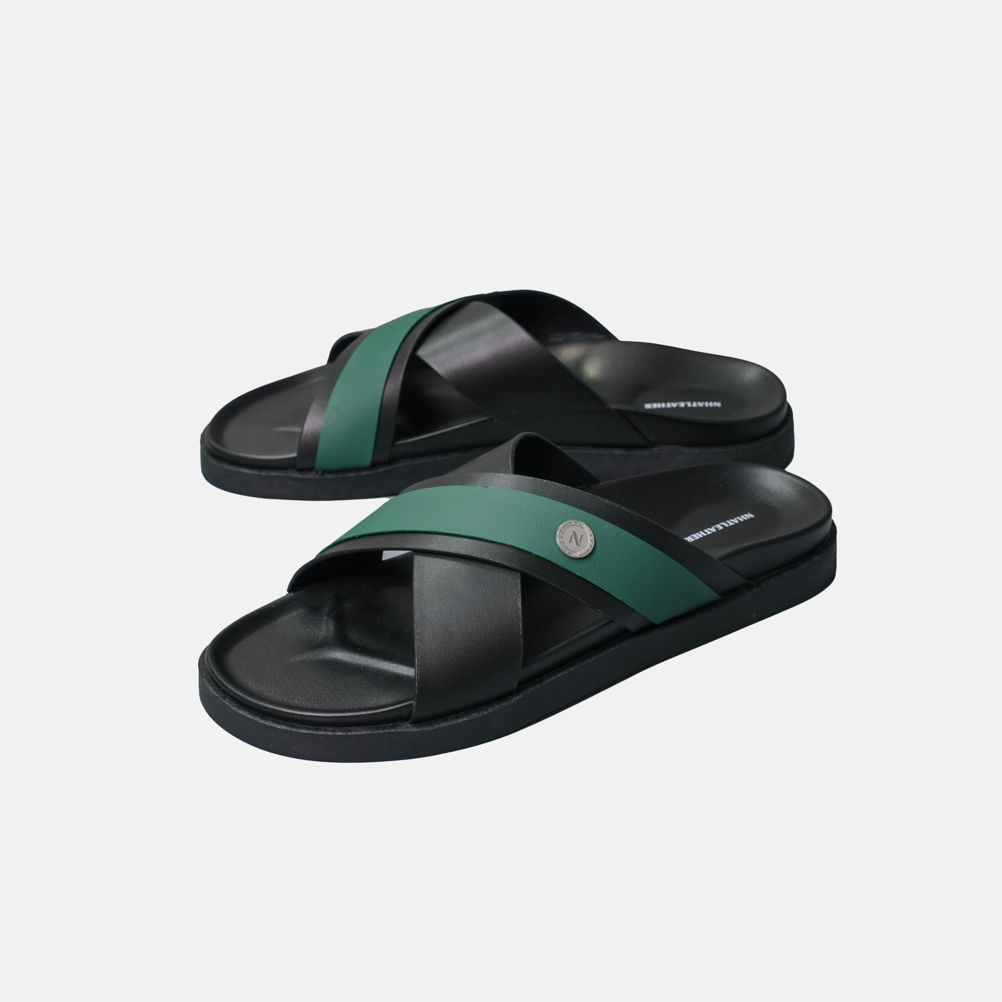 - Quai da chéo cách điệu: Quai chính dày 3-4mm, mép cắt sắc nét nhưng mềm mại, sơn viền phối màu theo dải đen sâu, xanh lá và nâu ấm - nét đặc trưng của thương hiệu NHATLEATHER. Phần chéo quai được gia công tinh xảo, không nứt hay phồng rộp, thể hiện chất lượng cao, chịu lực tốt mà vẫn linh hoạt khi xỏ dép, đảm bảo sự sang trọng, lịch lãm cho các quý anh.